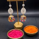 Description: Jhumka with coloured beads, a white peacock feather and a pearl