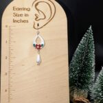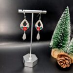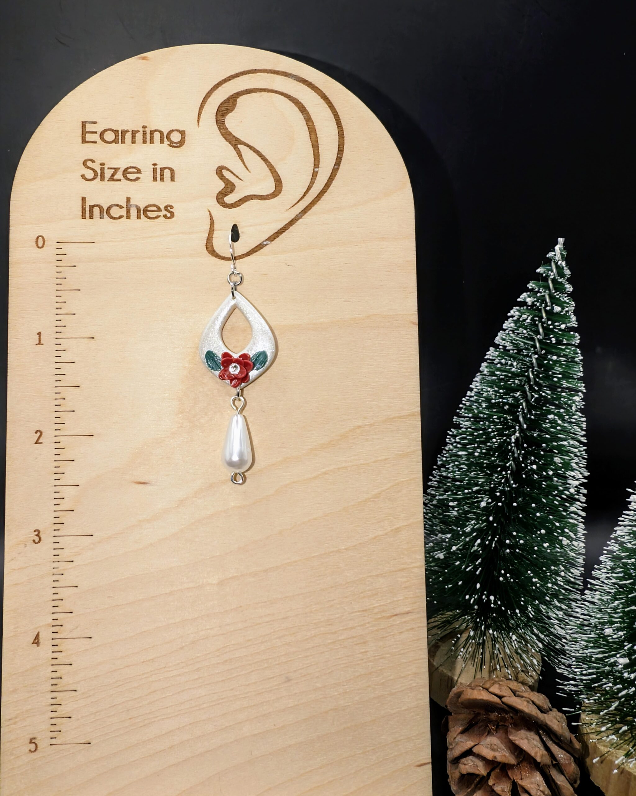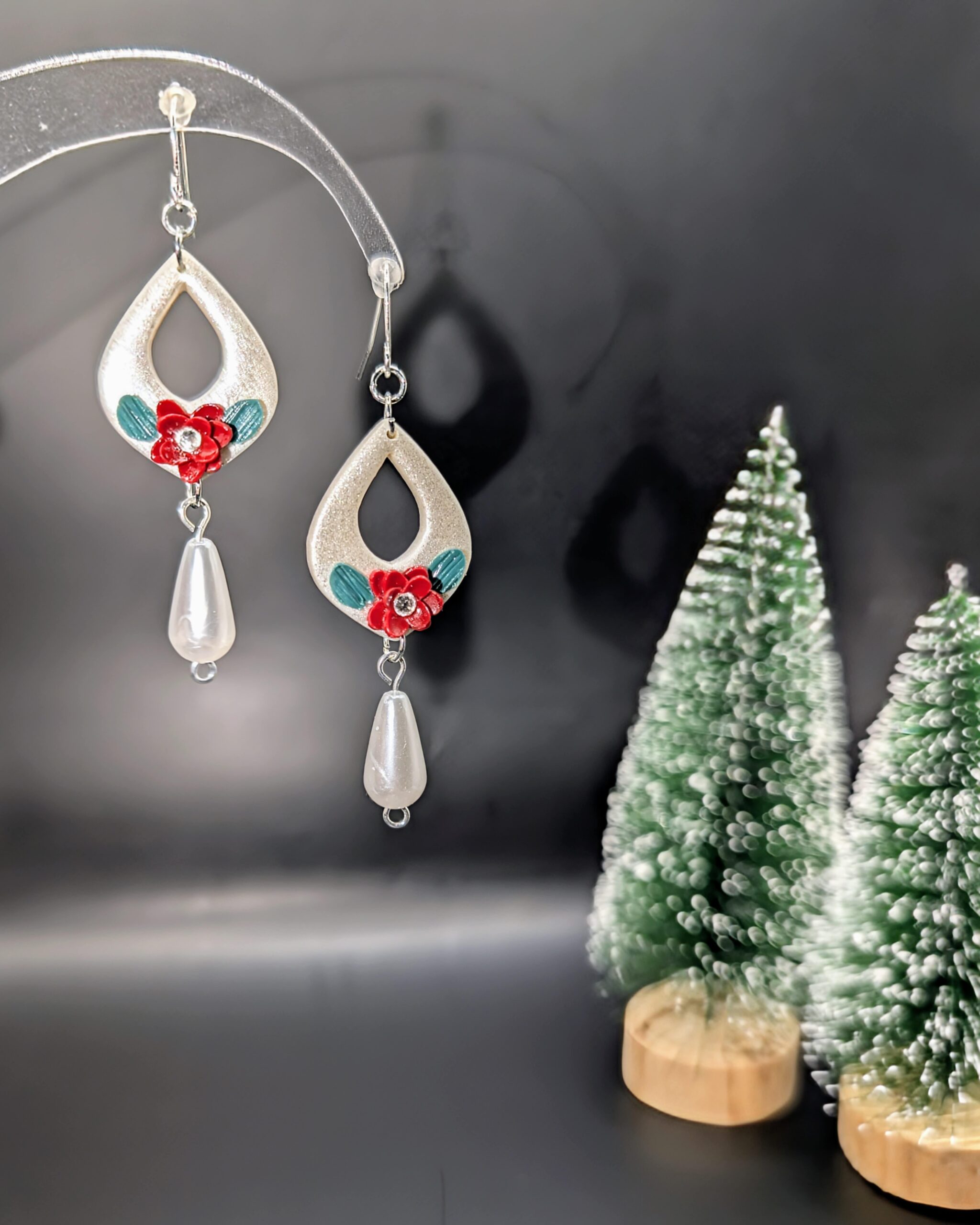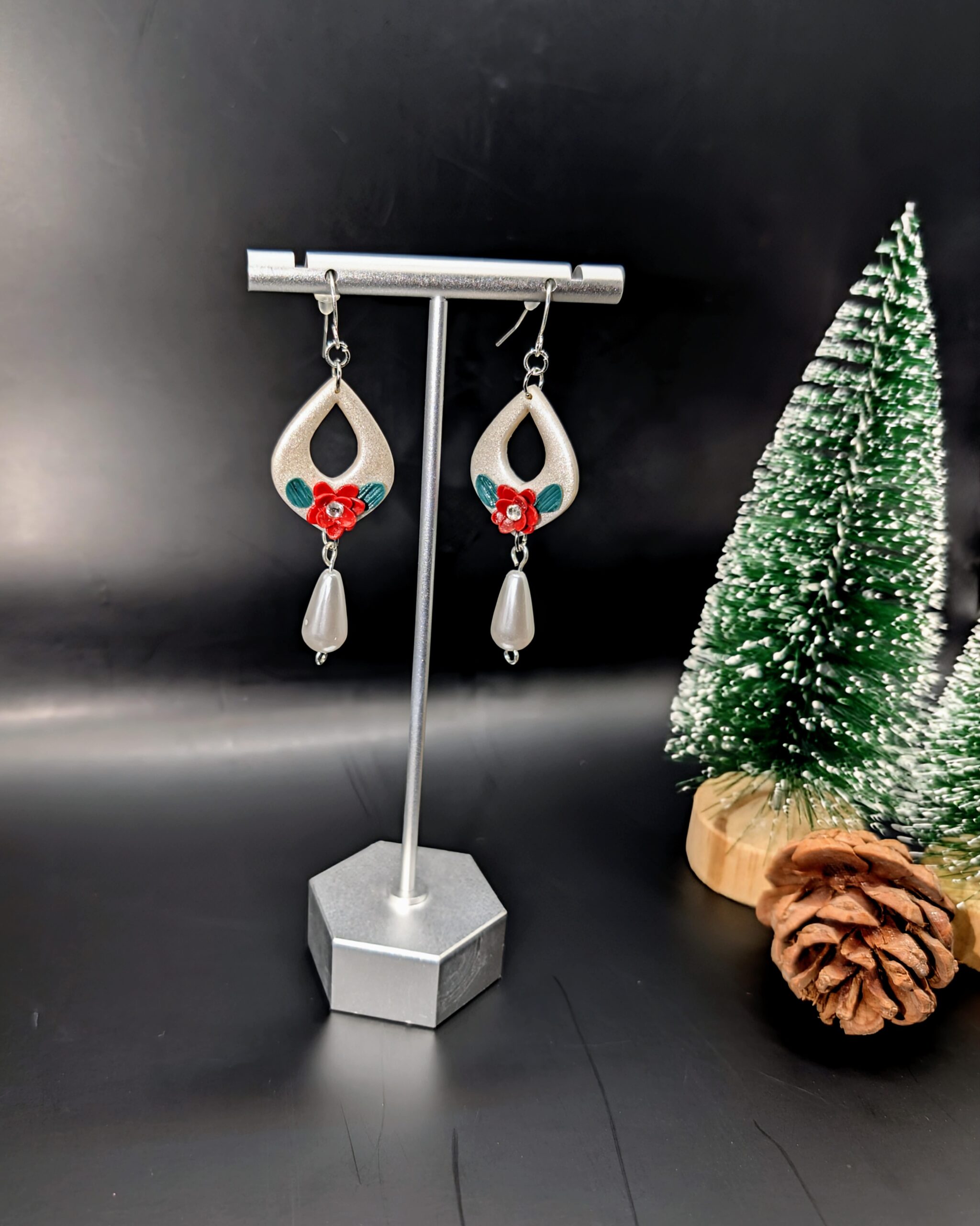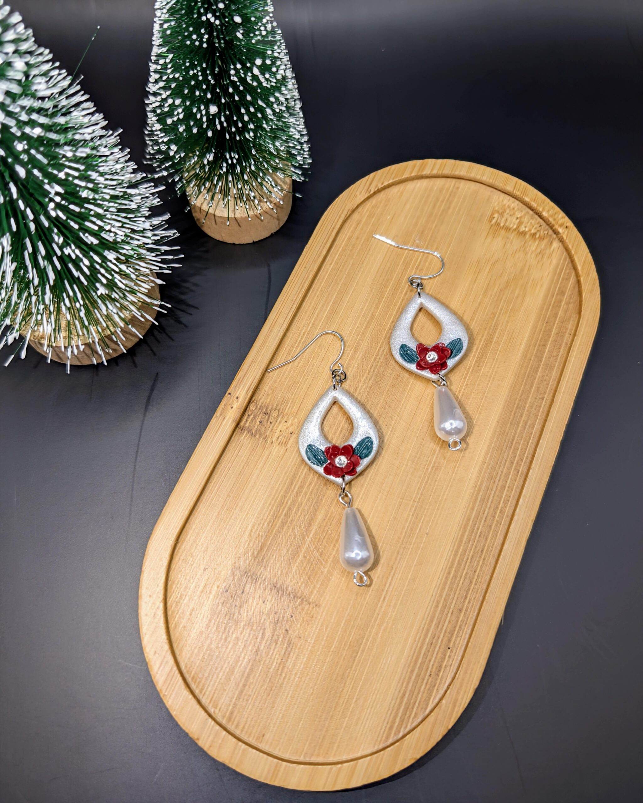 Description: These elegant teardrop earrings feature a metallic silver finish with a cutout design, accented by a vibrant red flower and green leaves. A delicate pearl-shaped drop hangs below, adding sophistication. Perfect for festive or formal occasions, they exude a winter wonderland charm!